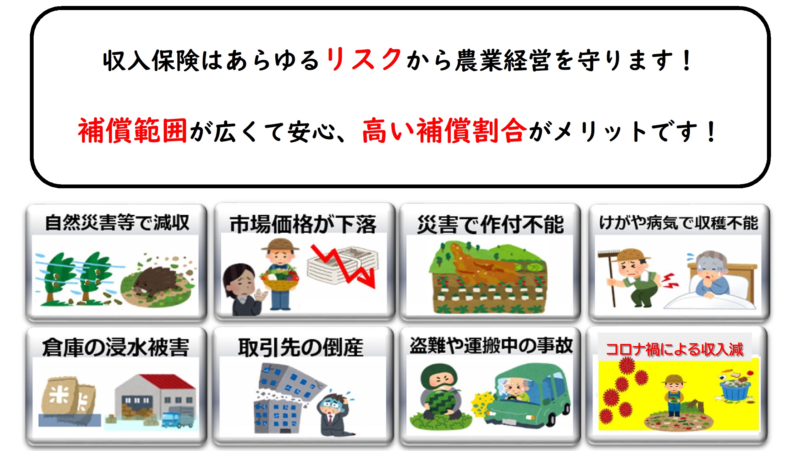 全ての農産物を対象に、以下のような自然災害による収量減少や新型コロナウイルスを要因とする価格低下等の農業者の経営努力では避けられない収入減少を広く補償します。