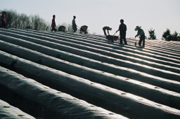 カーブした畝で農婦が作業しているところを望遠レンズで切り取っています。畝の曲線と農婦、クワ、バケツの位置がほどよく配置され、作者のセンスの良さが窺えます。 |
