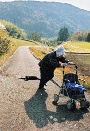 寝そべっている猫を、お婆さんがどう越えていったのか?不思議な写真です。猫がいなければごく普通の風景ですが猫のしぐさが、のどかさを強調した写真となっています。 |