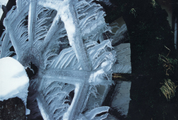 水車の氷柱が寒さを強調していますが、よく見ると氷柱は下に成長するものですから、少しづつ回っていたと想像できます。外側に生えた苔からすると老年の水車なのでしょうか、農村の冬景色もこういった表現があるのいかと思った作品です。 |