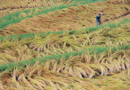 台風一過、倒れた稲を起こしている作業風景で、農業の厳しさを示した1枚です。緑色の草から棚田であることが理解できますが、日の光が当り、それを強調する時間で撮っていれば、より伝わる写真となったでしょう。 |