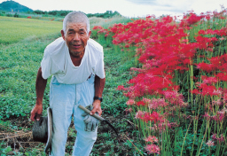 彼岸花の赤で季節を表現し、おじいさんの柔らかい表情がほのぼのとした感じを強調している写真です。シャツターチャンスが的確な作品です。 |