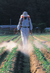 主題を真正面から撮り、黙々と作業をしている農夫の感じがよく出ています。背景が山陰で、射光線で畑と噴霧器の霧、農夫がより強調された作品です。 |