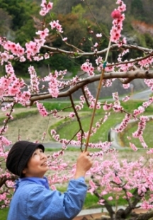 桃の花が咲誇る山里での受粉風景、やわらかい光が花と人物をきれいに表現しています。人物にピントがくればもっと良くなったと感じます。 |