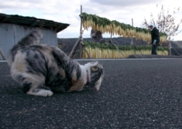 思わず笑ってしまう、ほほえましい写真です。低いカメラ位置が猫を強調していますが、猫の表情が見えるともっと良くなったと感じました。 |
