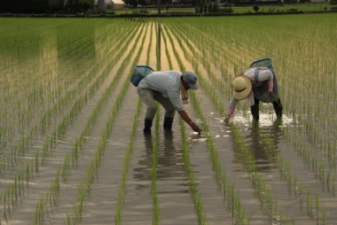 田植えの風景は水面に映りこむもので写真の印象が変わります。苗の色と鮮やかな夕日の金色が実りの秋を予感させています。 |