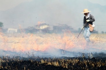 麦畑の野焼き風景は表現が難しいのですが、炎のかげろうで農夫と背景が絵画のような表現になっています。順光で撮られていますので炎の暑さが強調されています。 |