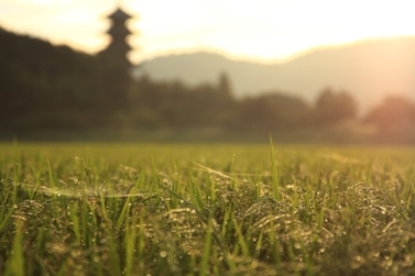 朝露の付いた稲穂がストレートに表現されています。ピントが浅いので背景はボケていますが、五重塔を感じさせ場所が説明されています。実りの秋を日の出前の風景で表現した作品です。 |
