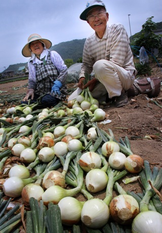 収穫した玉ねぎを前に、ご夫婦のカメラに向かっての笑顔がいいですね。ローアングルで被写体にぐっと近づいたフレーミングが単なる記念写真ではなくなっています。 |