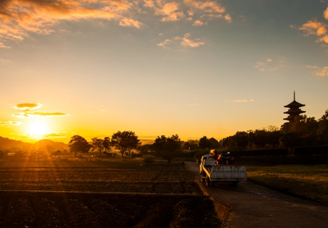 国分寺はよく撮られる被写体ですが、日没直前に農機具を積んだトラックの側面だけ見える。それぞれの位置関係が絶妙です。 |