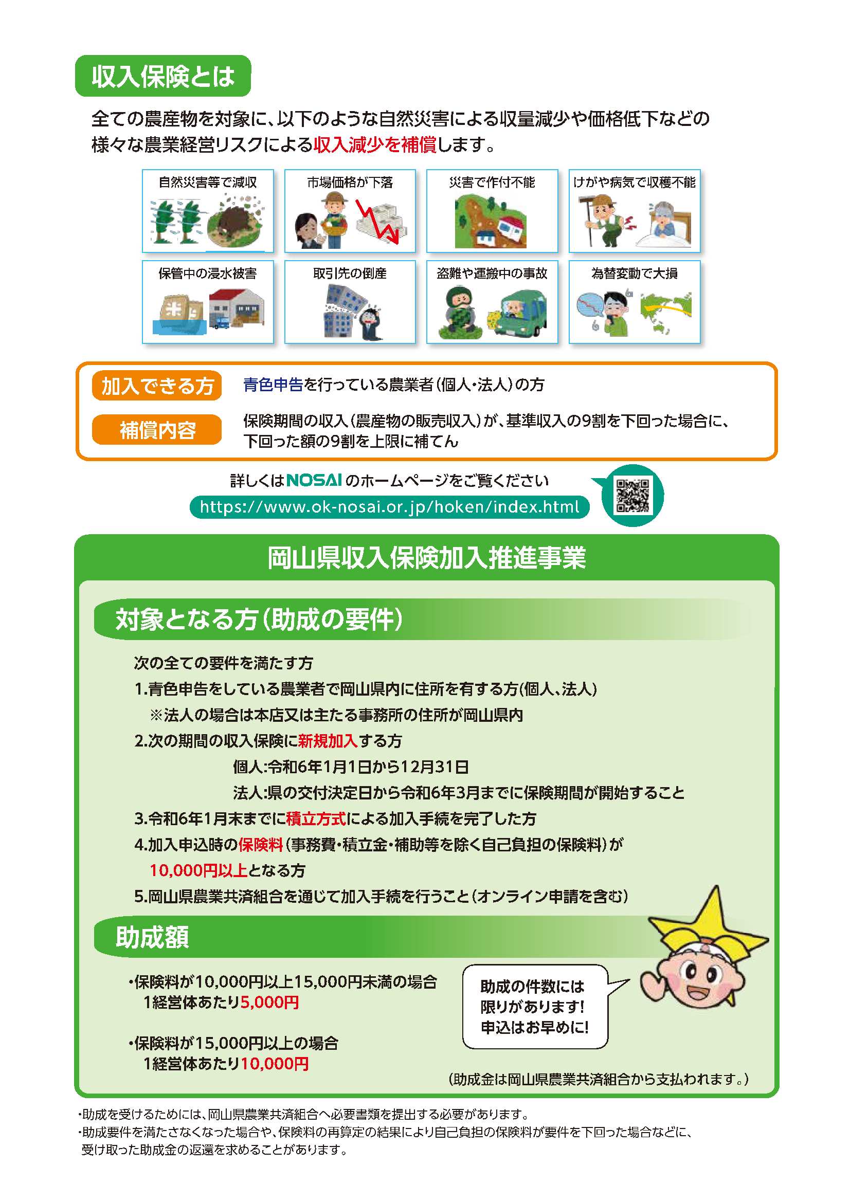 農業経営収入保険(収入保険)のご契約は本保険の事業主である全国農業共済組合連合会 (NOSAI全国連)の事業規程に基づきます。事業規程はこちらから参照いただけます。