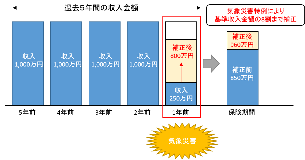 また、気象災害に被災した年の農業収入をその年の基準収入の8割まで上方修正できるようになりました(気象災害特例)。