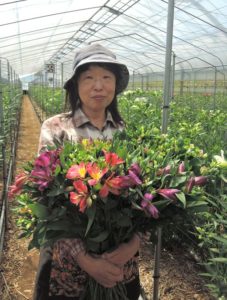 「多彩な色のアルストロメリアが楽しめます」と山中さん  鏡野町の山中幸子(やまなかさちこ)さん( 55 )は、ハウス3棟・15㌃で、オランダから苗を購入したアルストロメリアを10種類栽培。奥津花...
