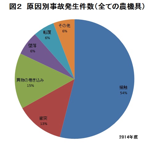 2014年度の農機具損害共済の引受台数は6336台です。そのうち約2・2%に当たる138台に事故が発生し、総額約1800万円の共済金をお支払いしました。主な事故原因は、約7割が「接触・衝突」で、次いで「異物の巻き込み」が15%と稼働中の事故が多くなっています(図2)。