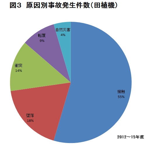 12年度から15年度までに田植機の事故は22件発生しています。事故の原因としては、「接触」が最も多く、次いで「墜落」となっています(図3)。